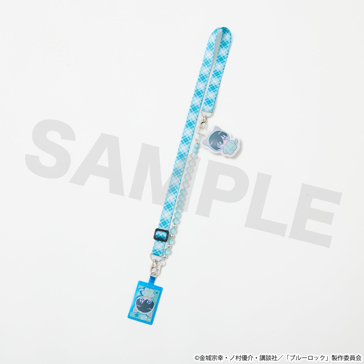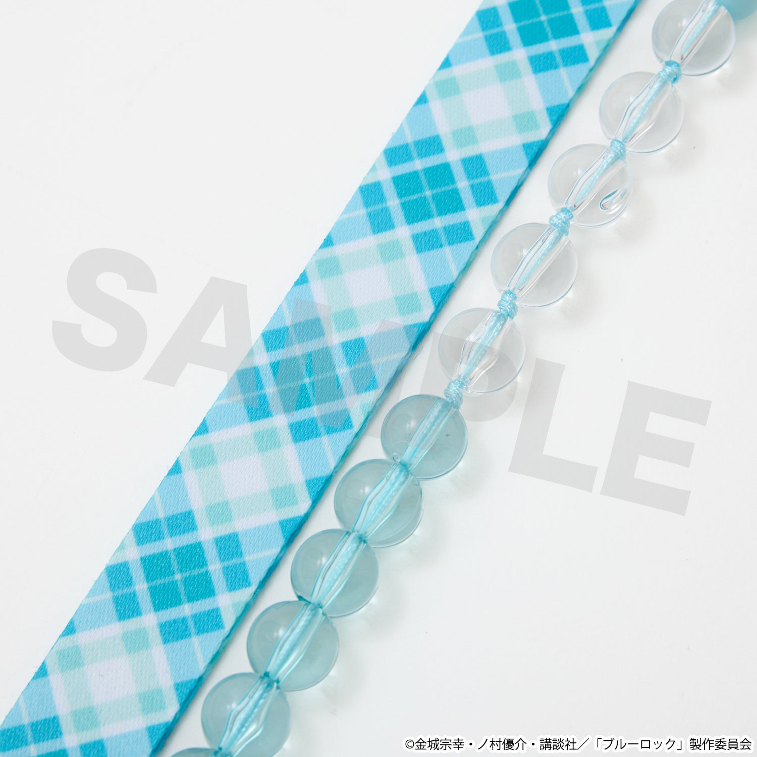 イメージカラーのチェック柄とクリアビーズを組み合わせたネックストラップで、普段使いにもぴったりなデザインに仕上げました。
