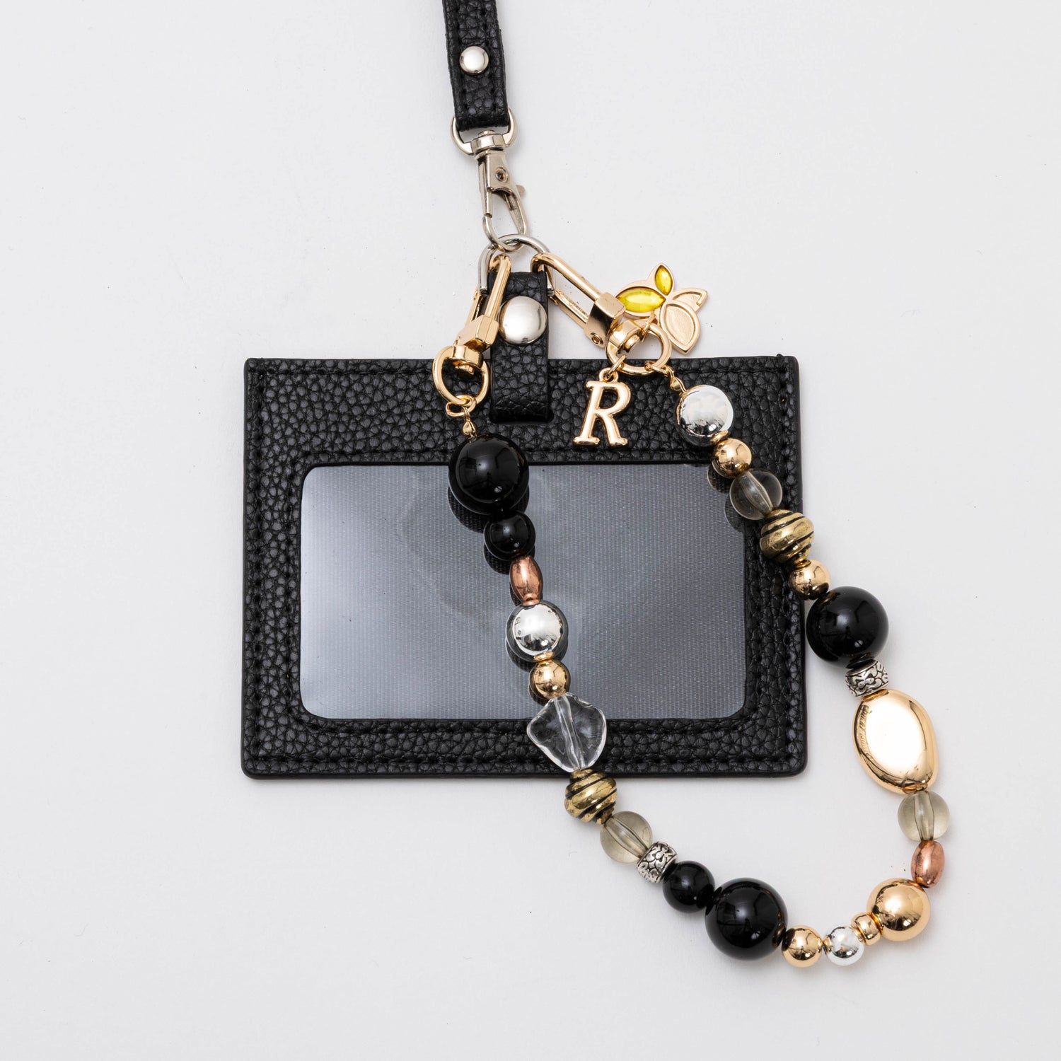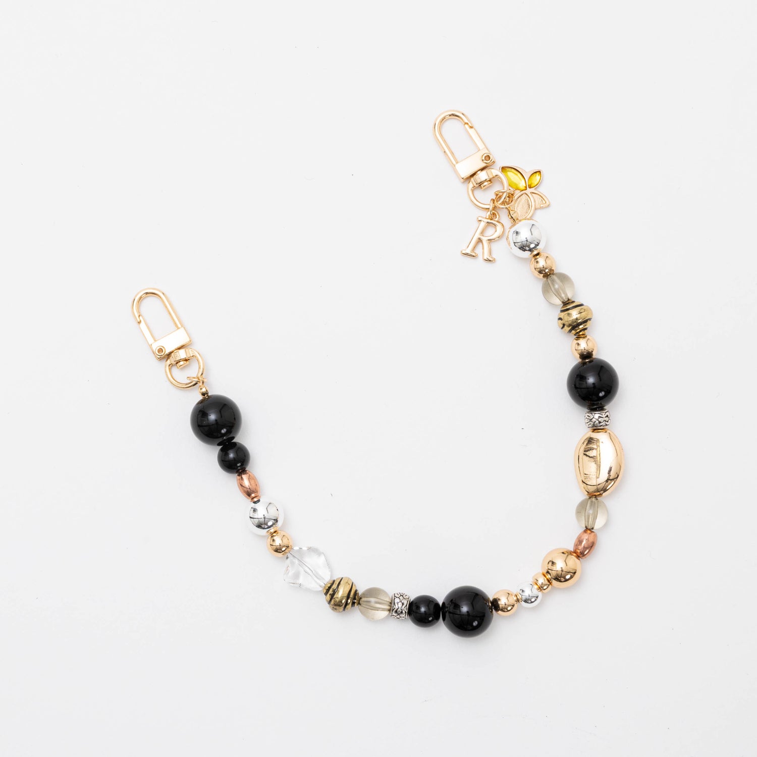 ビーズストラップは、イエローやブラックのビーズを使用し、須王芦佳をイメージ。イニシャルのRとキャラクターカラーのストーンが映える蝶のチャームで、鮮やかな雰囲気のデザインに仕上げました。