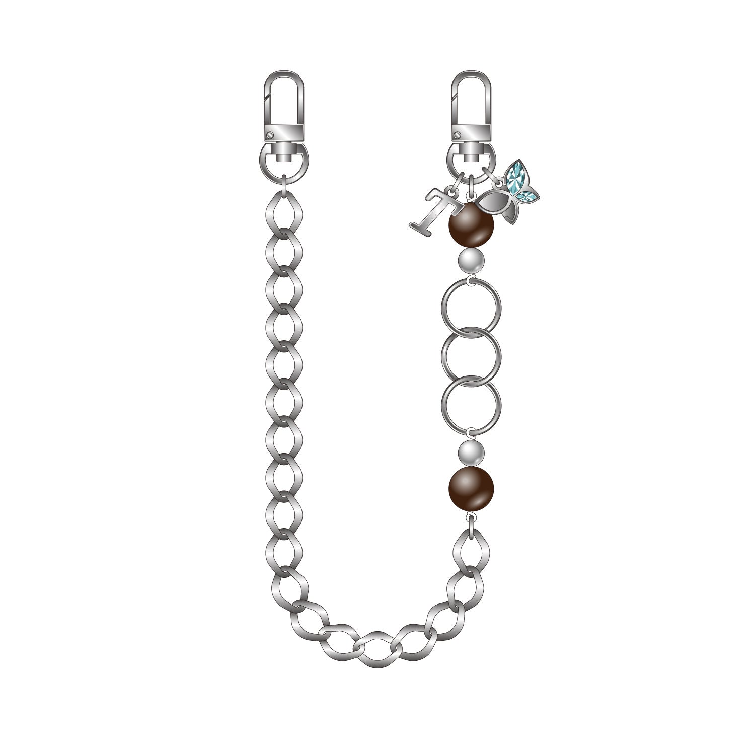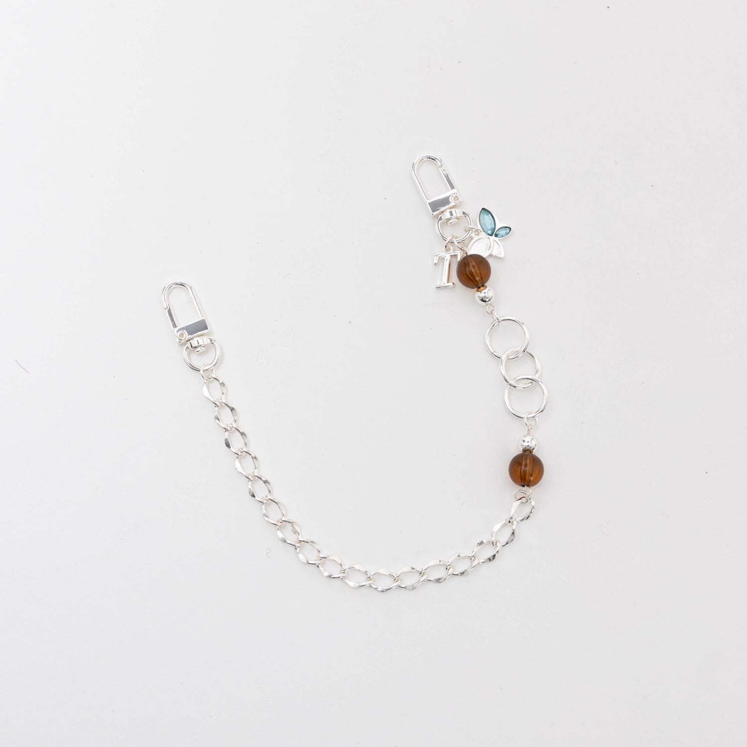 ビーズストラップは、シルバーのチェーンとブラウンのビーズを使用し、槻本大河をイメージ。イニシャルのTとキャラクターカラーのストーンが映える蝶のチャームで、シックなデザインに仕上げました。