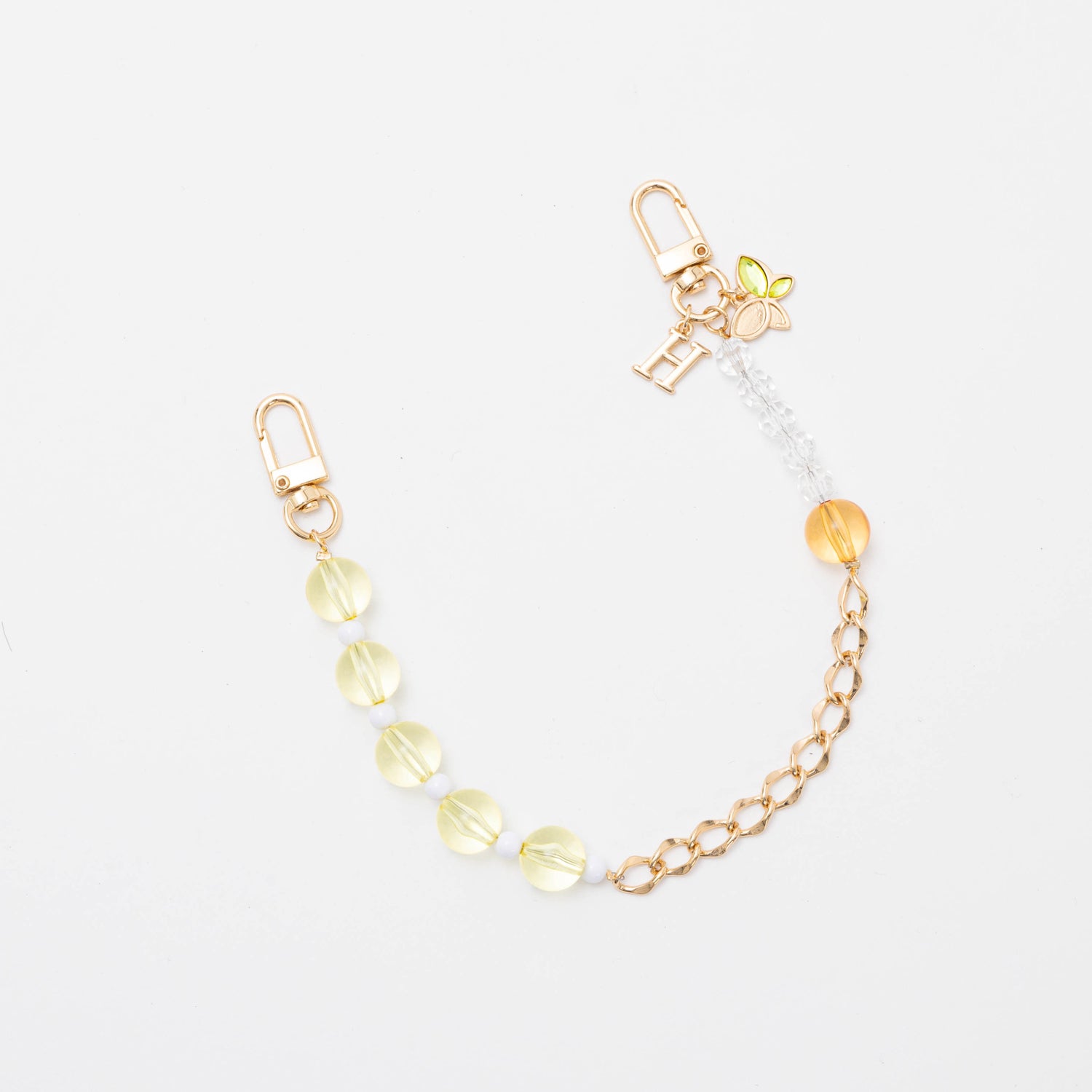 ビーズストラップは、イエローやオレンジのビーズを使用し、壱川春日をイメージ。イニシャルのHとキャラクターカラーのストーンが映える蝶のチャームで、壱川春日らしいデザインに仕上げました。