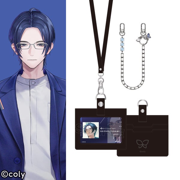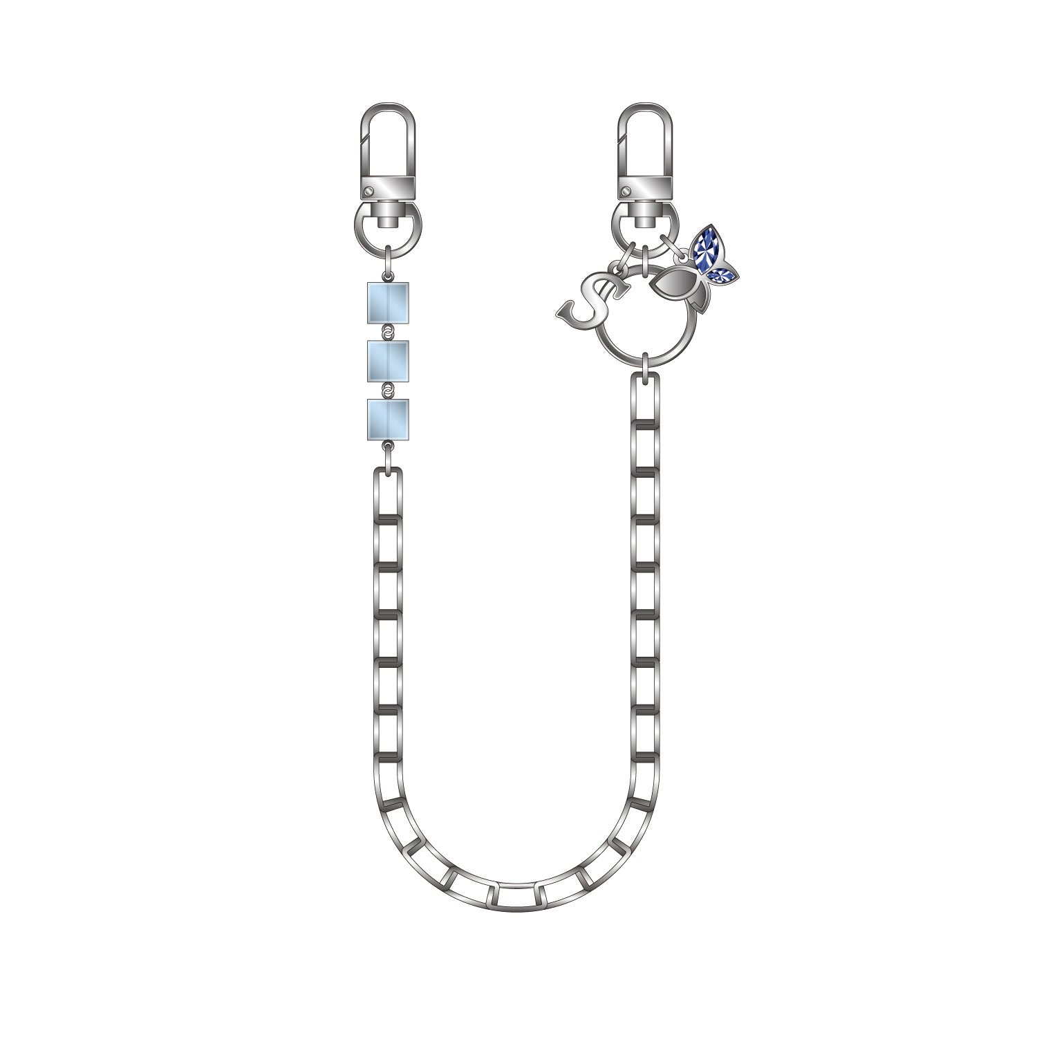ビーズストラップは、シルバーのチェーンやブルーのビーズを使用し、節見静をイメージ。イニシャルのSとキャラクターカラーのストーンが映える蝶のチャームで、知的な雰囲気に仕上げました。