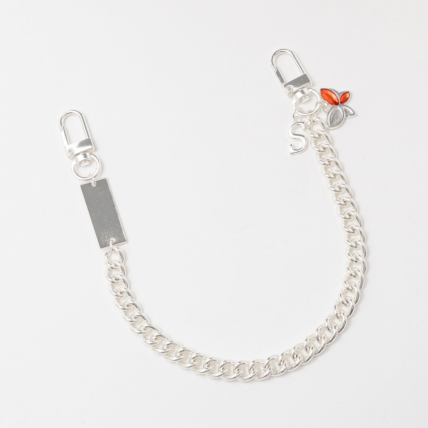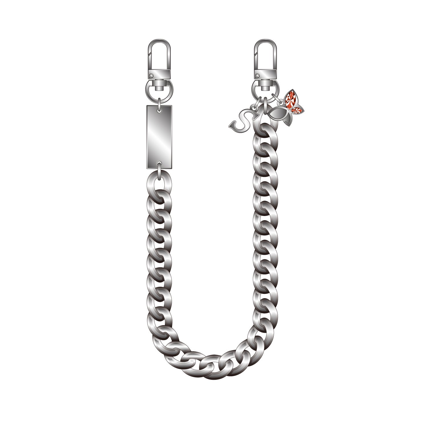 ビーズストラップは、力強いシルバーのチェーンやプレートを使用し、新開戦をイメージ。イニシャルのSとキャラクターカラーのストーンが映える蝶のチャームで、ソリッドなデザインに仕上げました。