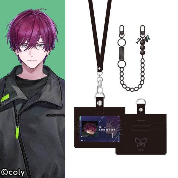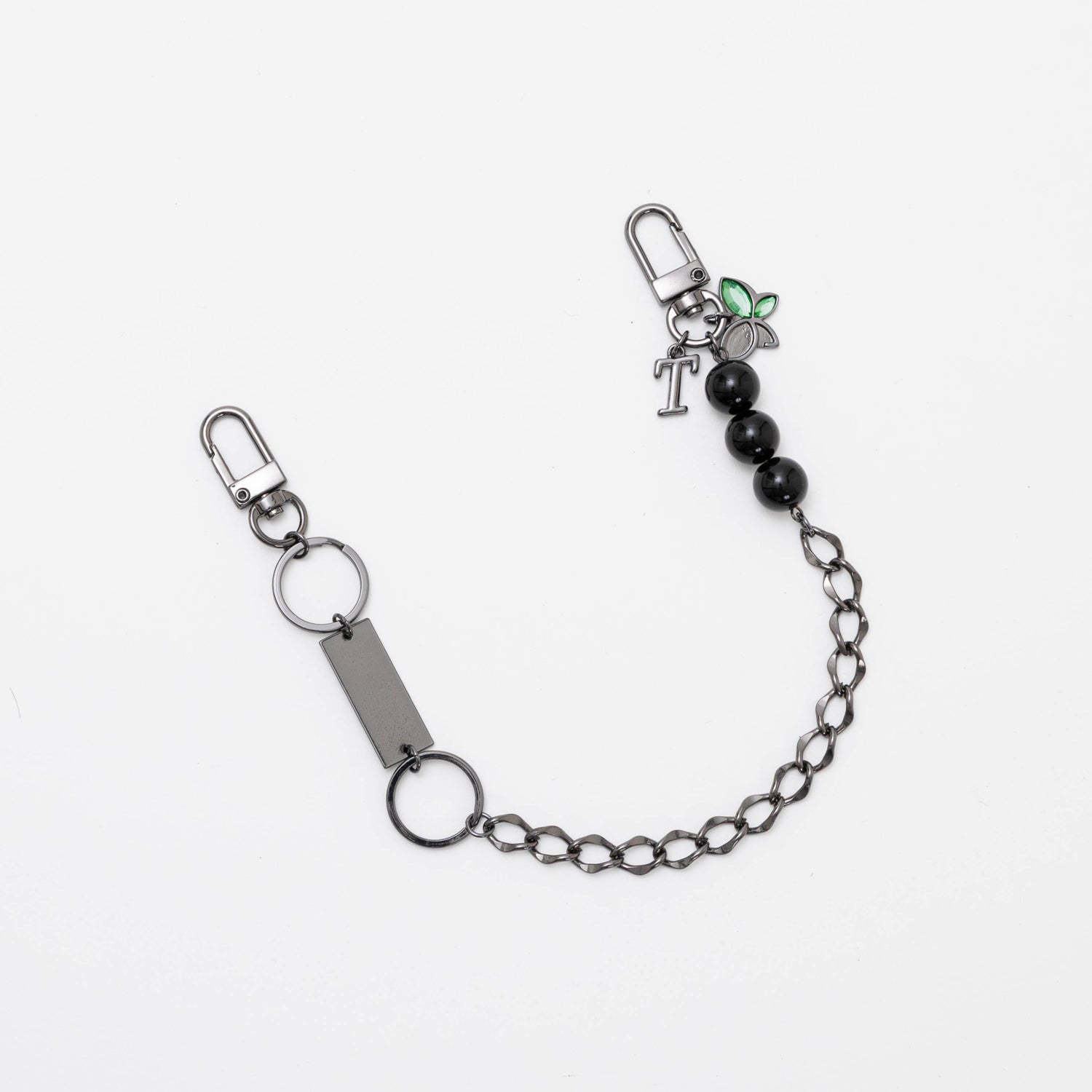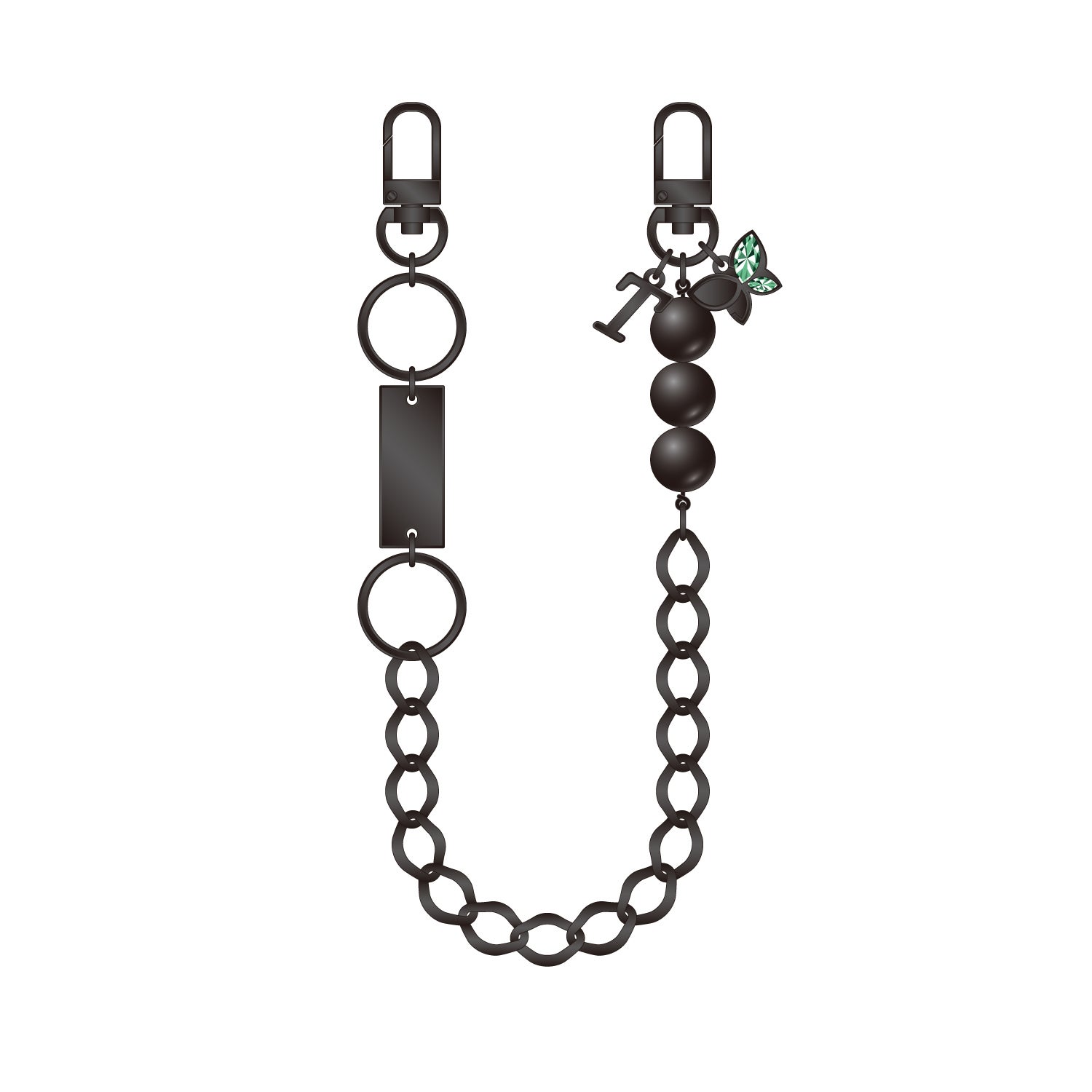 ビーズストラップは、ブラックのビーズやチェーンを使用し、恩田灯世をイメージ。イニシャルのTとキャラクターカラーのストーンが映える蝶のチャームで、スマートなデザインに仕上げました。