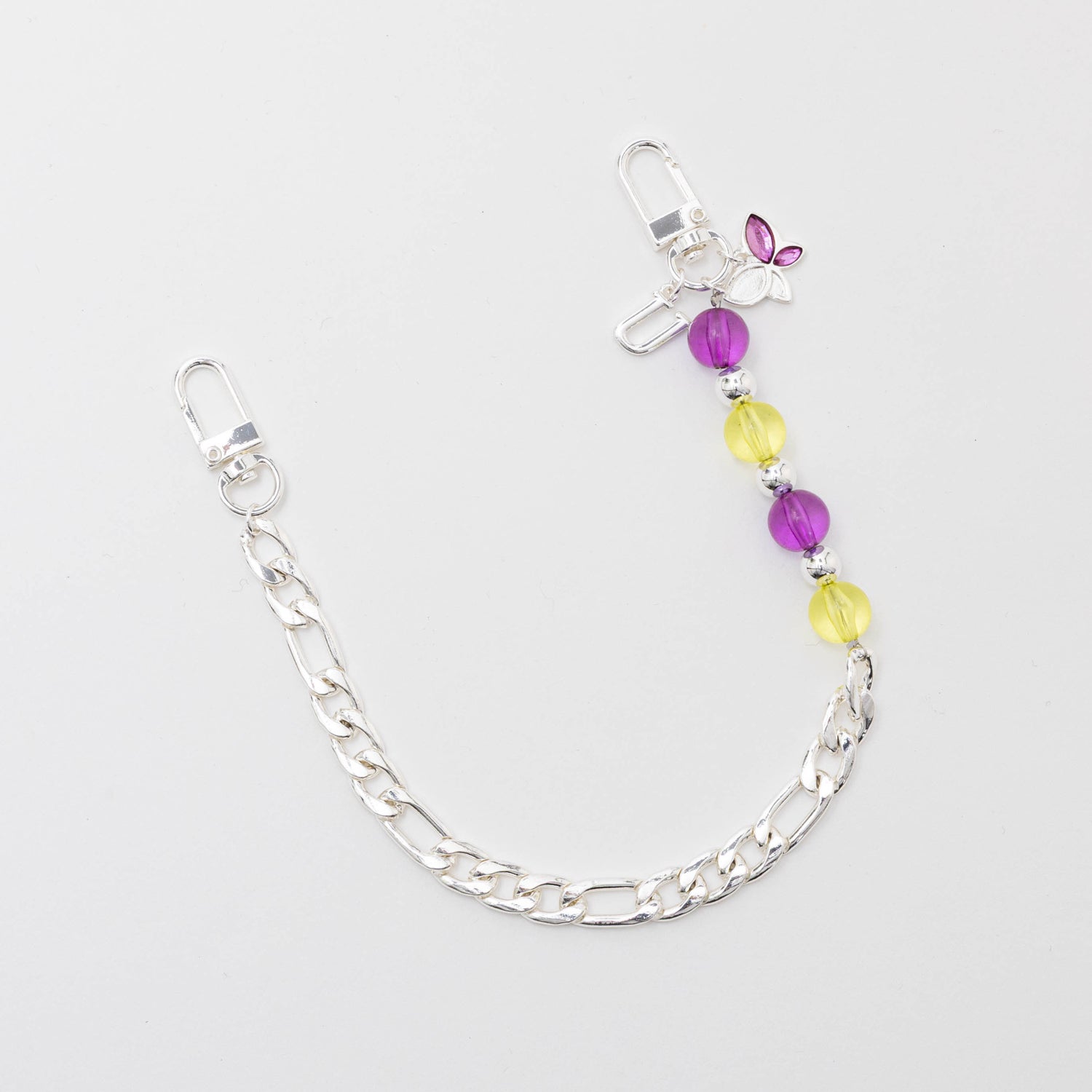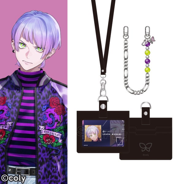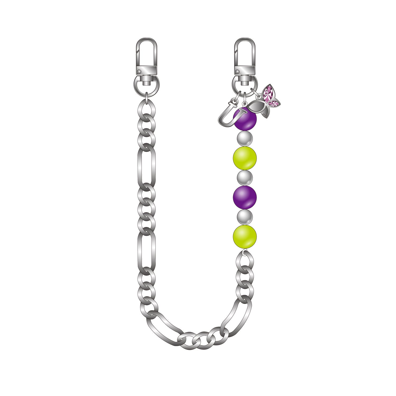 ビーズストラップは、グリーンとパープルのビーズやシルバーのチェーンを使用し、麻波麗をイメージ。イニシャルのUとキャラクターカラーのストーンが映える蝶のチャームで、アグレッシブなデザインに仕上げました。