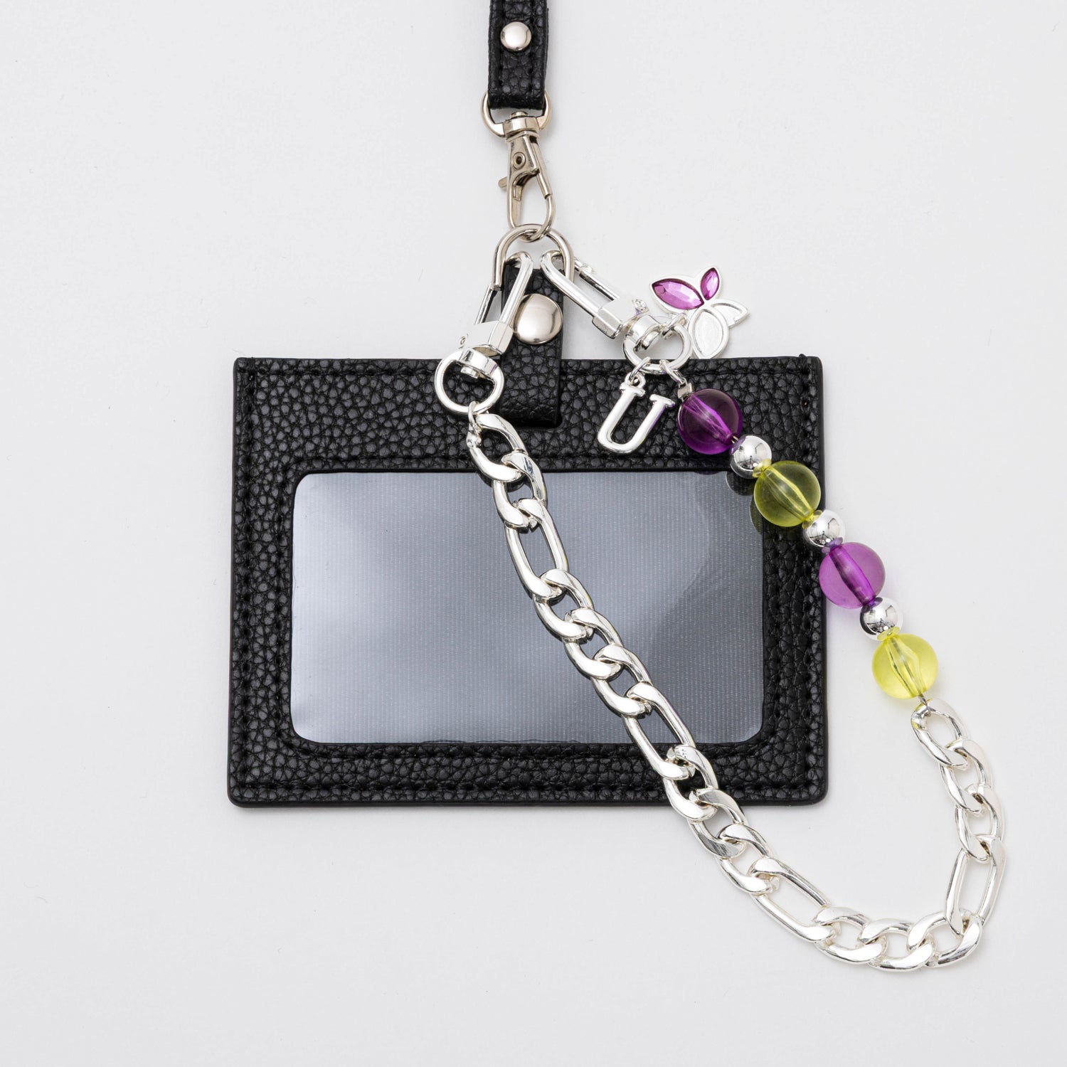 素材/ IDカードケース:合成皮革、ポリエステル、ポリ塩化ビニール ビーズストラップ:鉄、アクリル樹脂、合金 カード:ポリエチレンテレフタレート(PET)