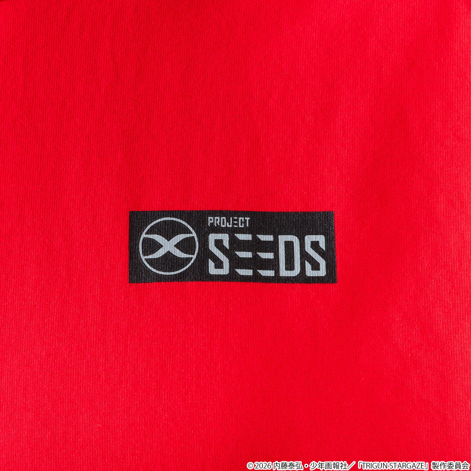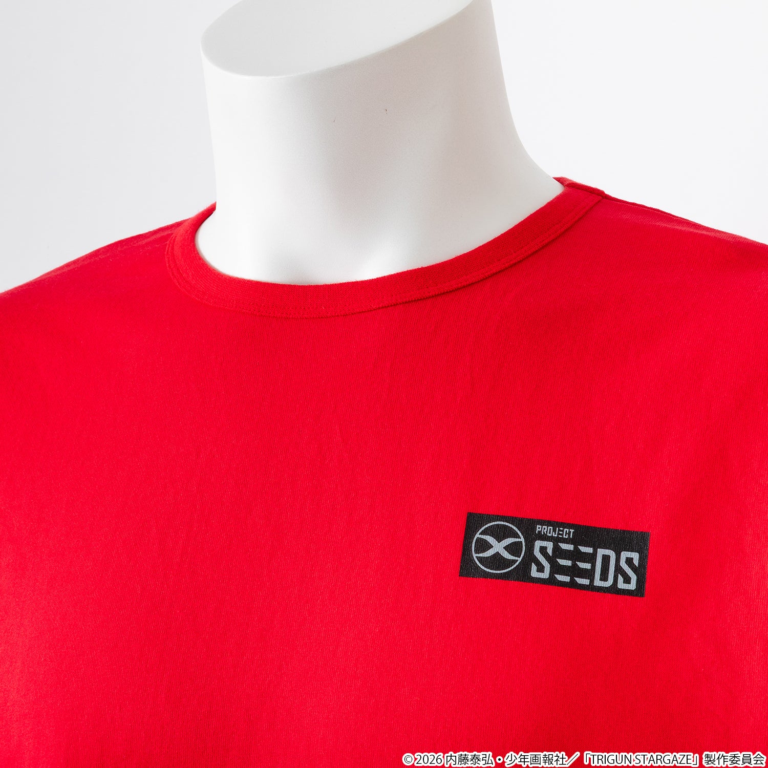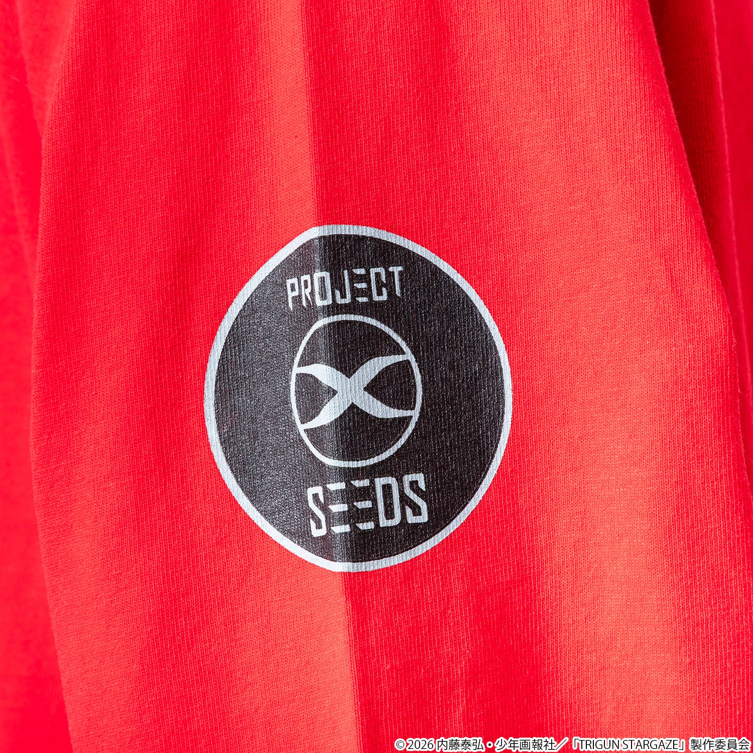 ヴァッシュの義手をイメージした左袖のデザイン、右袖と左胸の「Project SEEDS」のマークなど、着るだけでヴァッシュの気分を味わえる仕様。